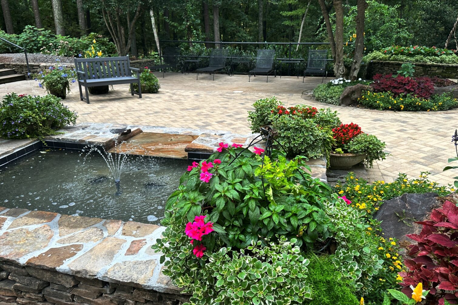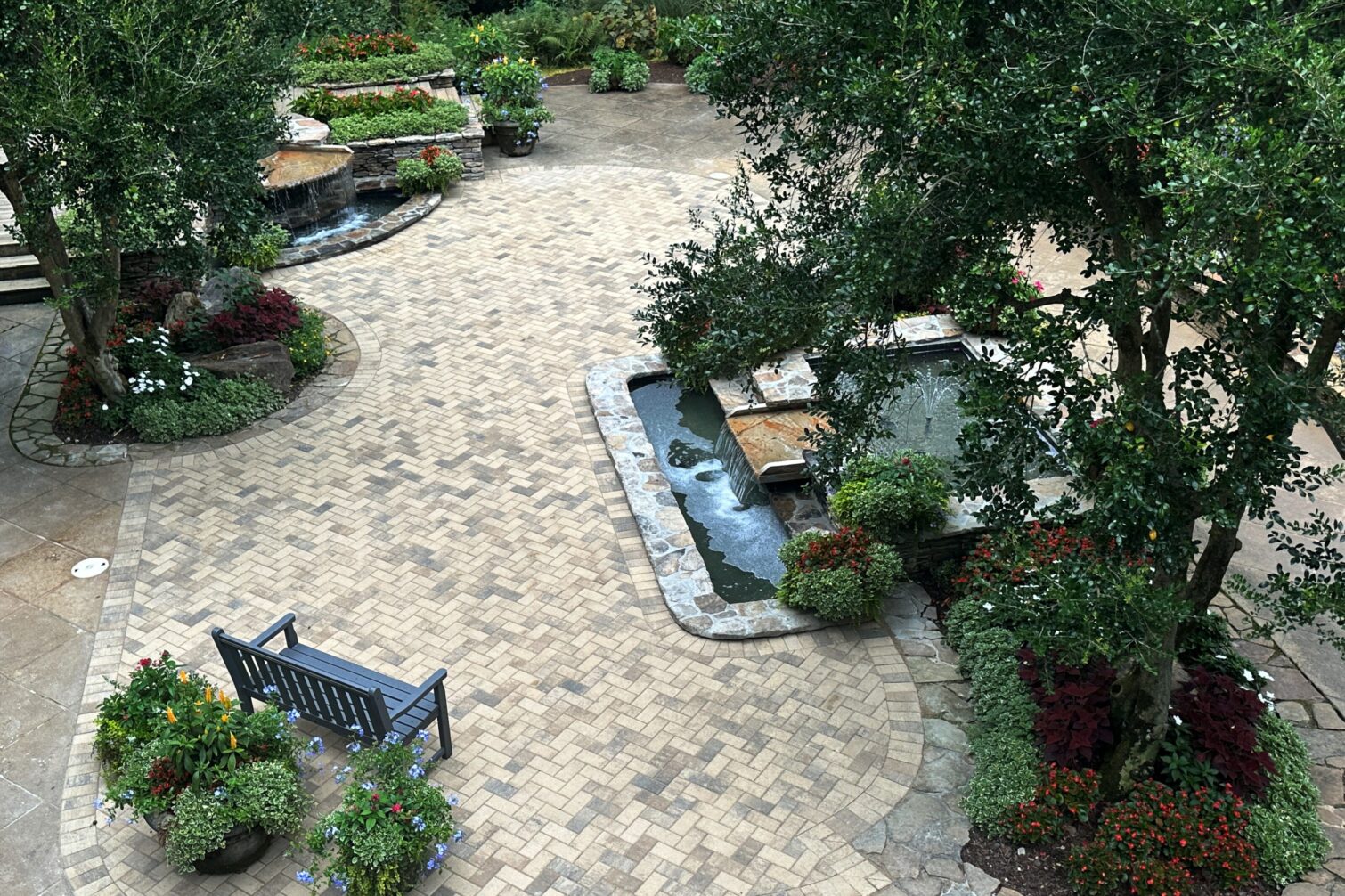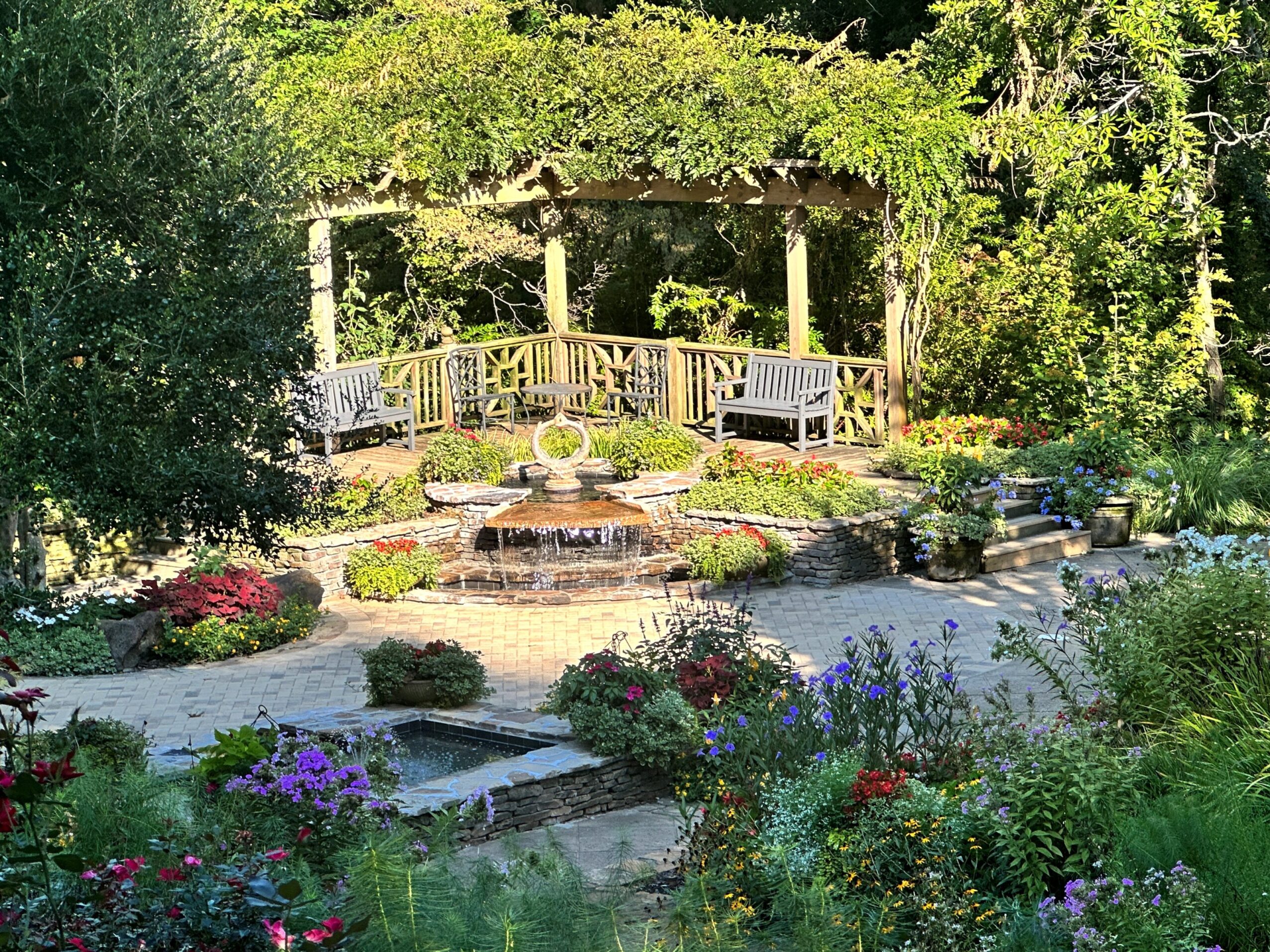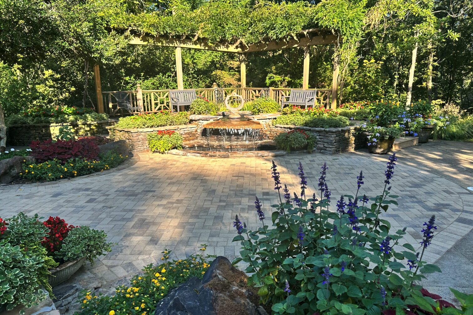 Seating areas are arranged with large planters filled with flowers, an arbor with vines and hanging flower baskets.