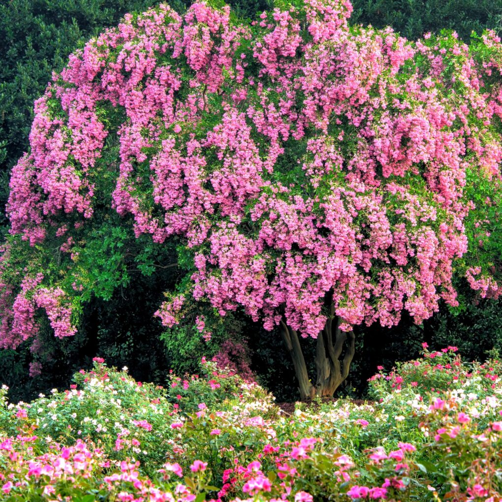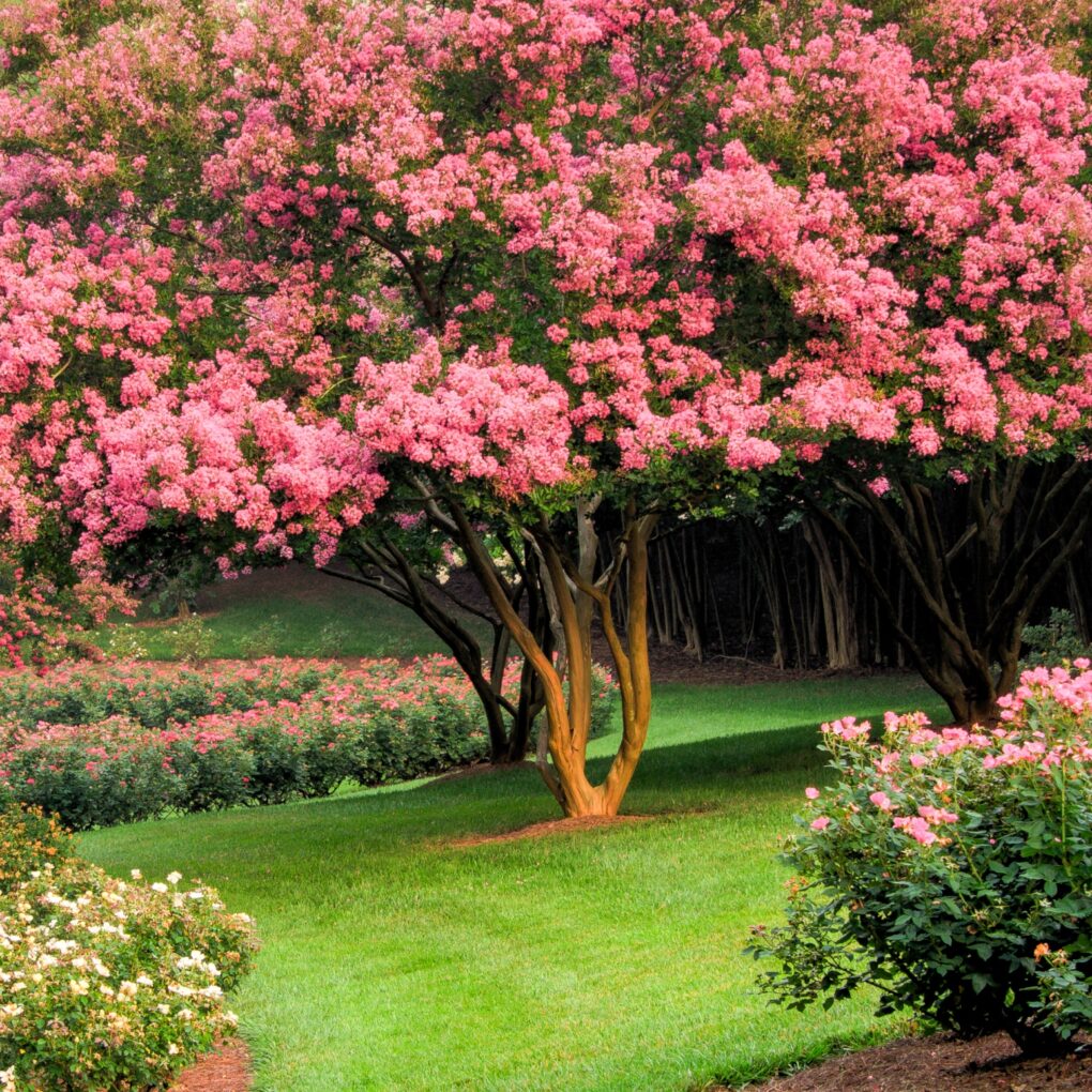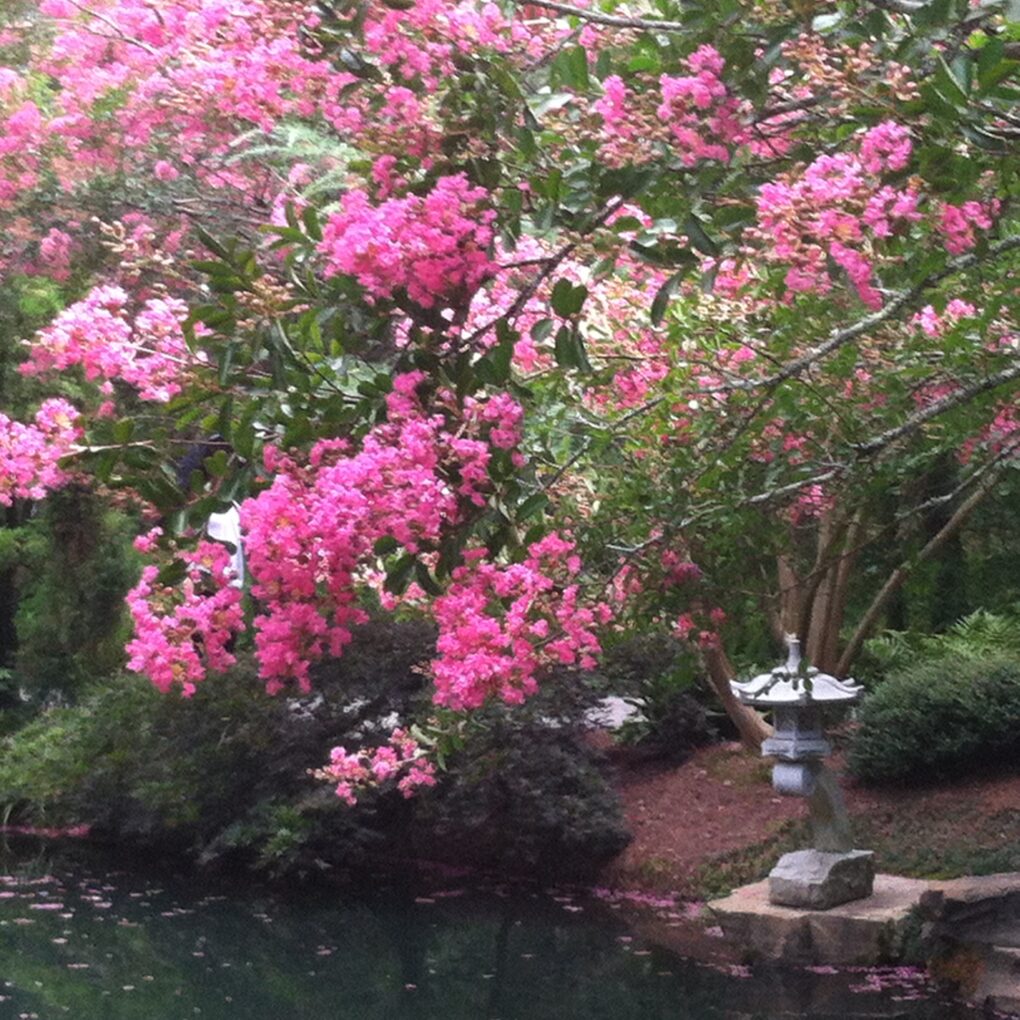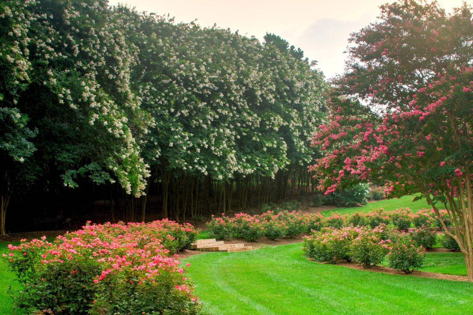 More crape myrtles, in several shades of pink, mauve, lavender, white and red are sprinkled throughout the landscape.