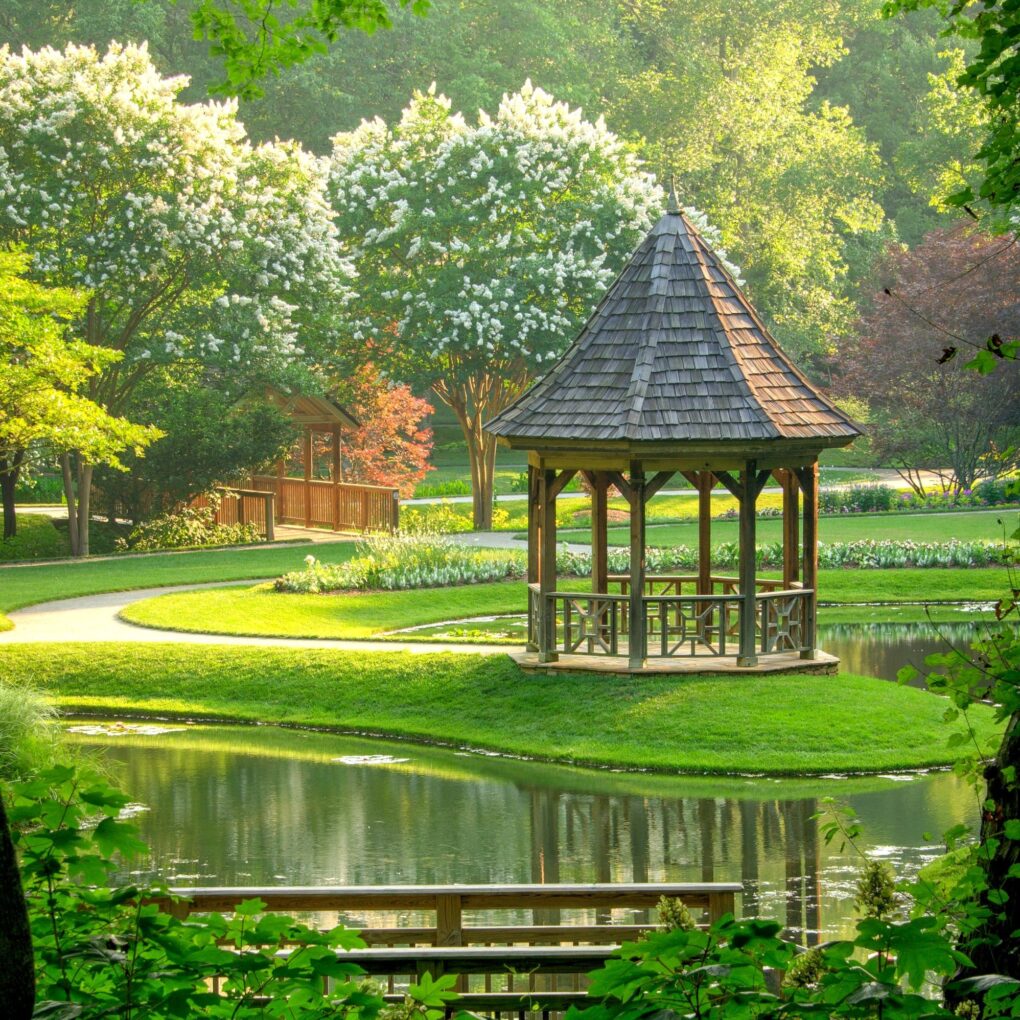 Near the entrance of the Gardens, looking down into the valley, are 100 white ‘Natchez’ crape myrtle trees sweeping the eye to a view of the North Georgia mountains.