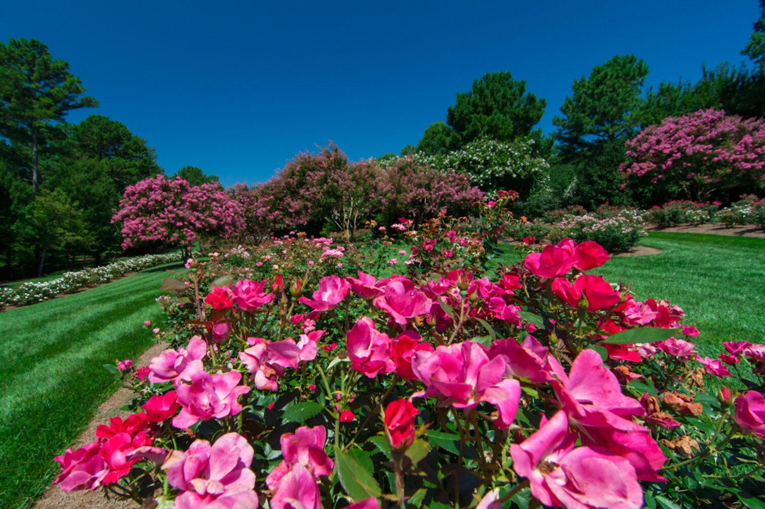 Above the Rose Gardens, an allée of 100 ‘Natchez’ crape myrtles descend a gentle slope to a level viewing area and then ascend a gentle slope to the Daylily Garden.