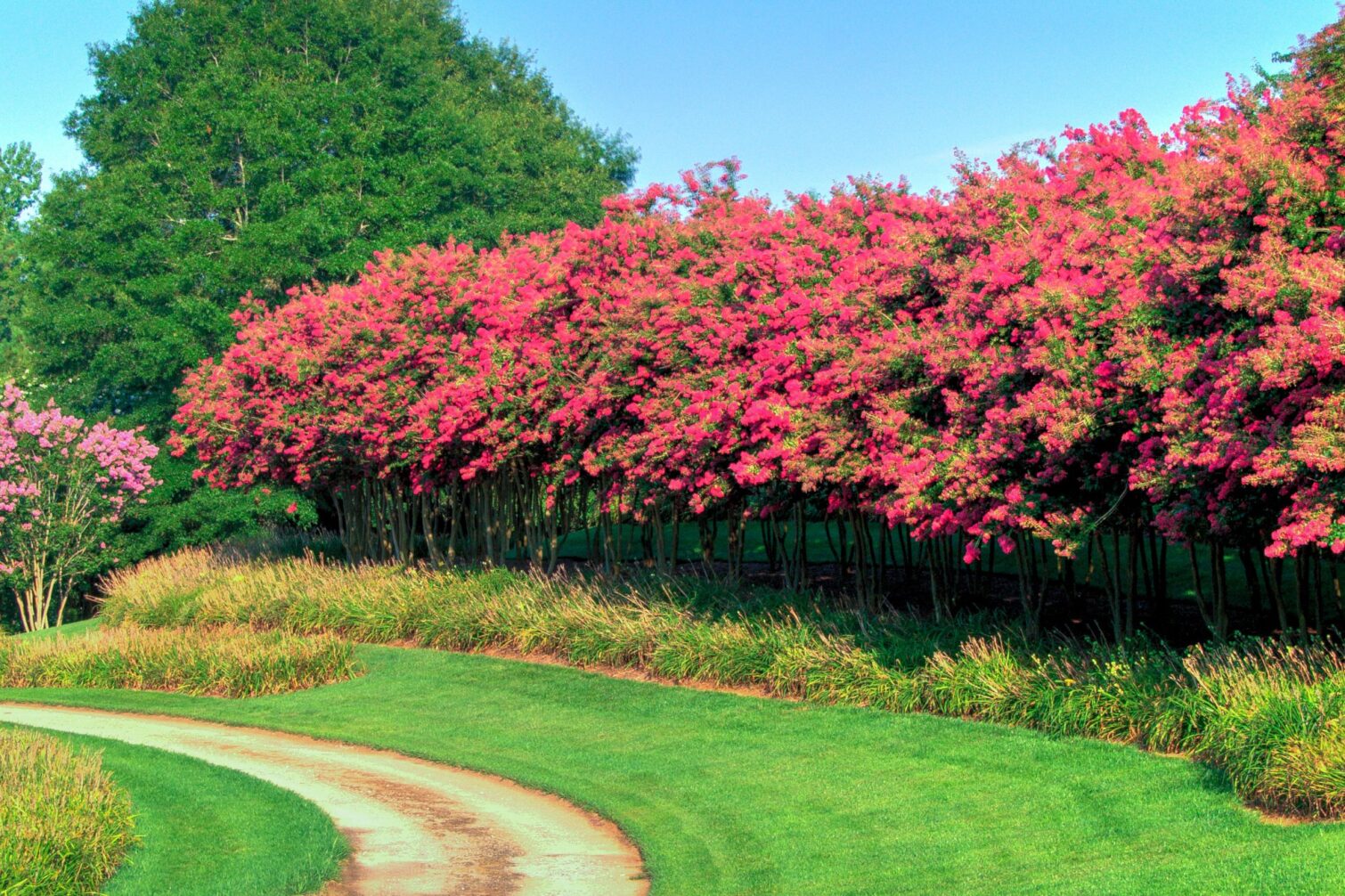 The Daylily Gardens has an allée of 70 red crape myrtles that provide shade for viewing the daylilies.