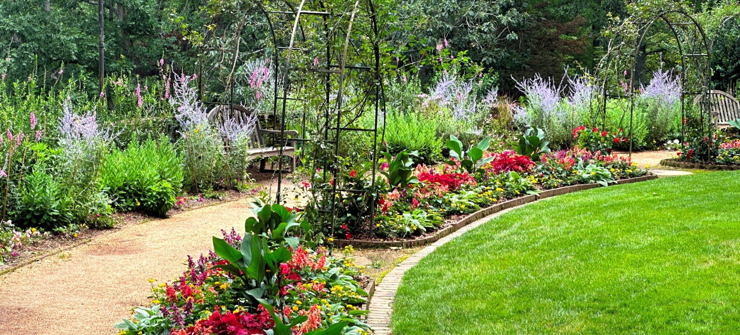 Another level provides metal arches that support climbing White Dawn roses with benches in their shade.