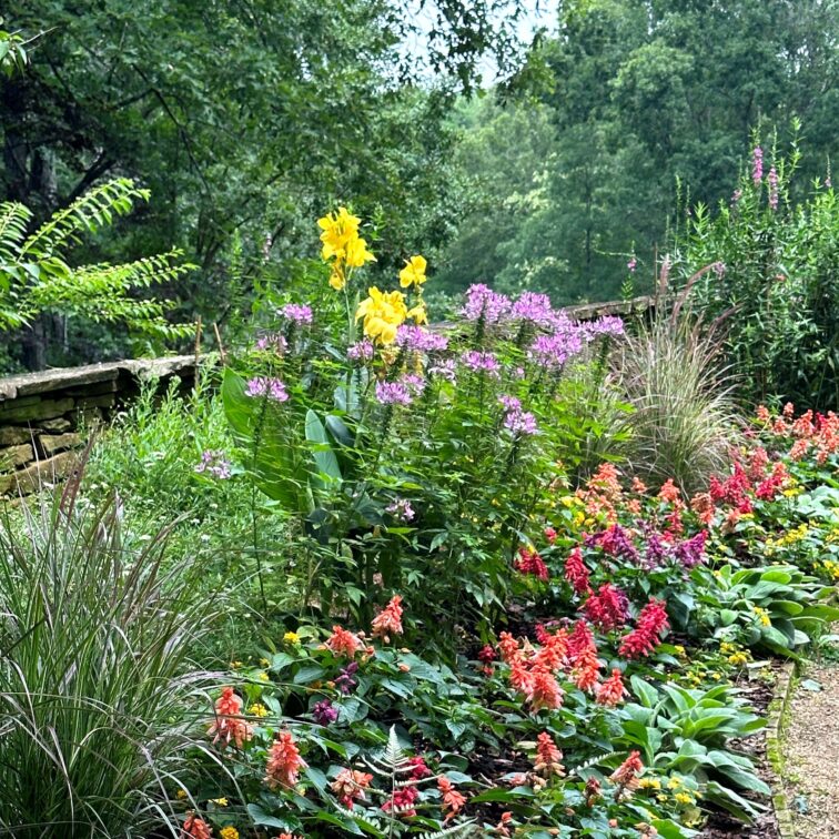 Dry stacked Tennessee field stone walls frame the curved beds planted with annuals and perennials.